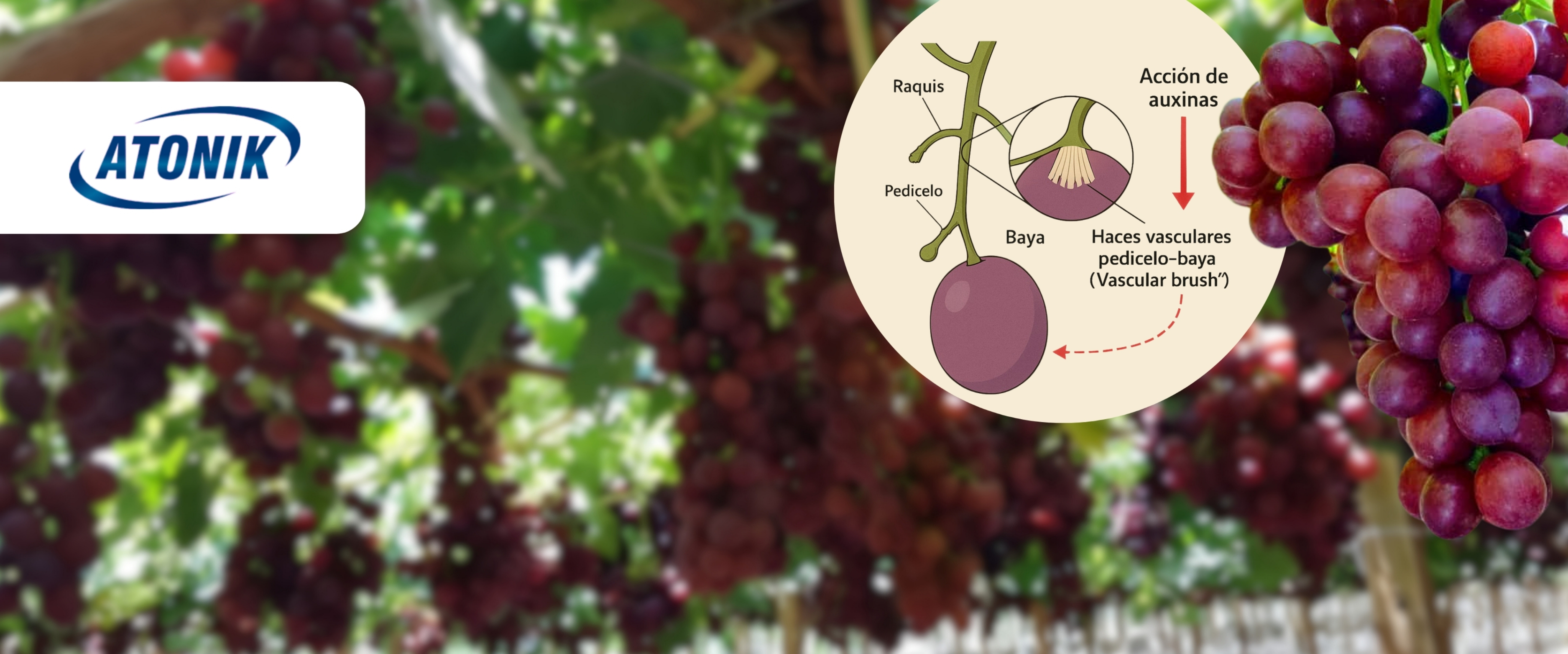 El éxito de la uva de mesa moderna depende de asegurar una fuerte conexión vascular entre el pedicelo y la baya. La ciencia demuestra que las auxinas son esenciales en este proceso, y Atonik®, gracias a su exclusiva formulación en base a nitrofenoles, potencia esta fisiología natural.