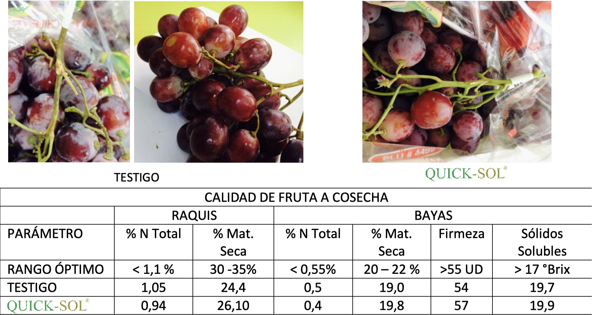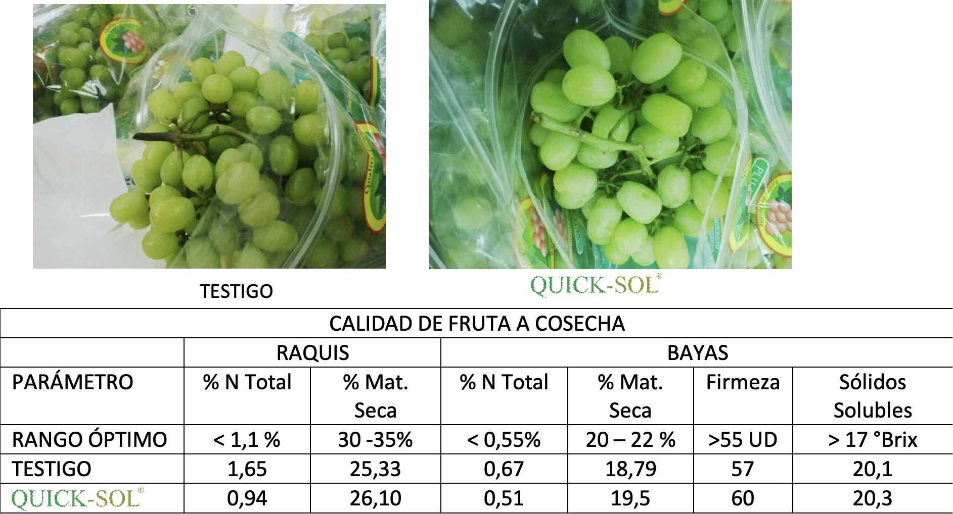 - Mayor firmeza y vida de postcosecha: los frutos tratados con Quicksol® mantienen su estructura por más tiempo.